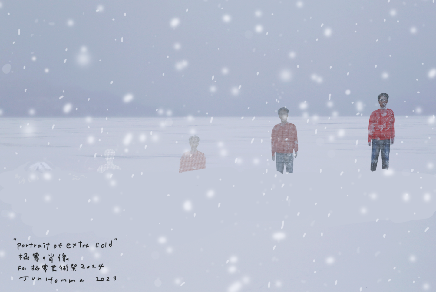 風景はそこに住み関わってきた人によってつくられ、人もまた風景によってつくられている。 しかしその関わりは「不可視」である。私は極寒芸術祭において 2015 年以降、これをテーマにした作品を制作してきた。 人や風景や様々な事物は凍り、雪に覆われ、やがては見えなくなり、そして巡る。 極寒の雪原に消えてゆく私自身のセルフポートレイトに、この場所に流れてきた固有の時間を 体現させたい。