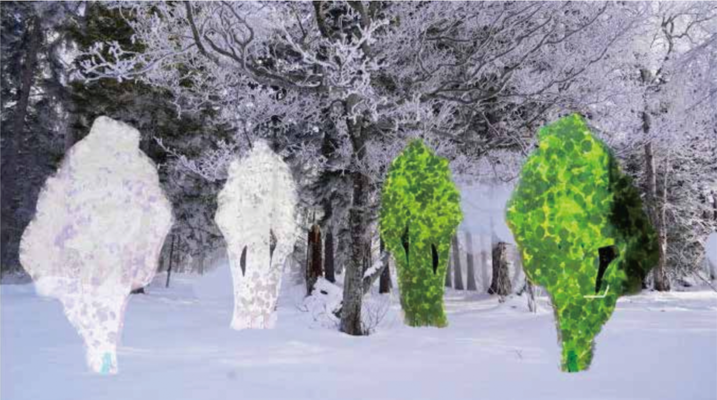 弟子屈において積雪が見られない春から秋の風景を集め、それらを冬の弟子屈に「冬眠」させることで習慣的な風景のオーバーラップを描く。観る人に、ある時に見えていてもある時には見えなくなっていくモノやコトから想起されるイメージについて思索を巡らせてほしい。