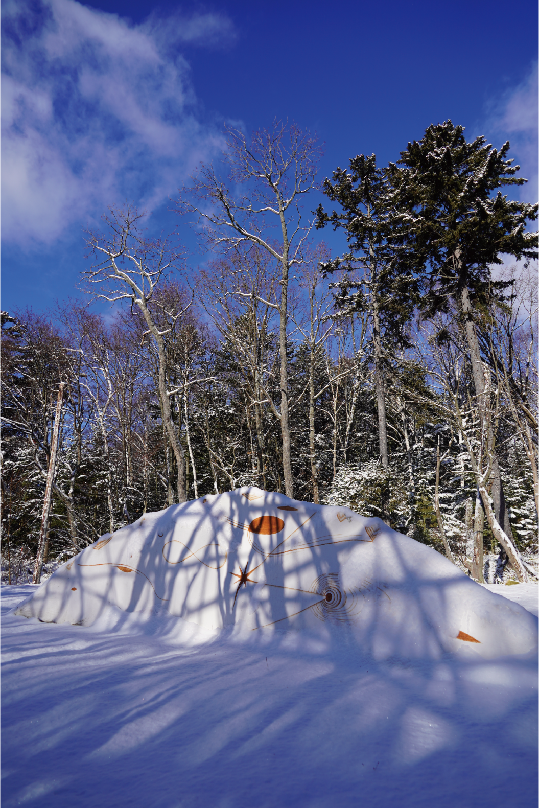 3年前はエコロジカルな観点から素材に漆喰を使い、一昨年は倒木によって壊れた部分の修復再生を行いました。昨年は滞在制作にコロナに罹患、待機期間中に構想を練った絵を漆喰部分に描きました。しかし、雨、風、雪、さらに極寒の厳しい環境によって作品は風化、腐敗、崩壊しました。本年は大半を取り壊しリニューアルします。(写真は昨年の作品)