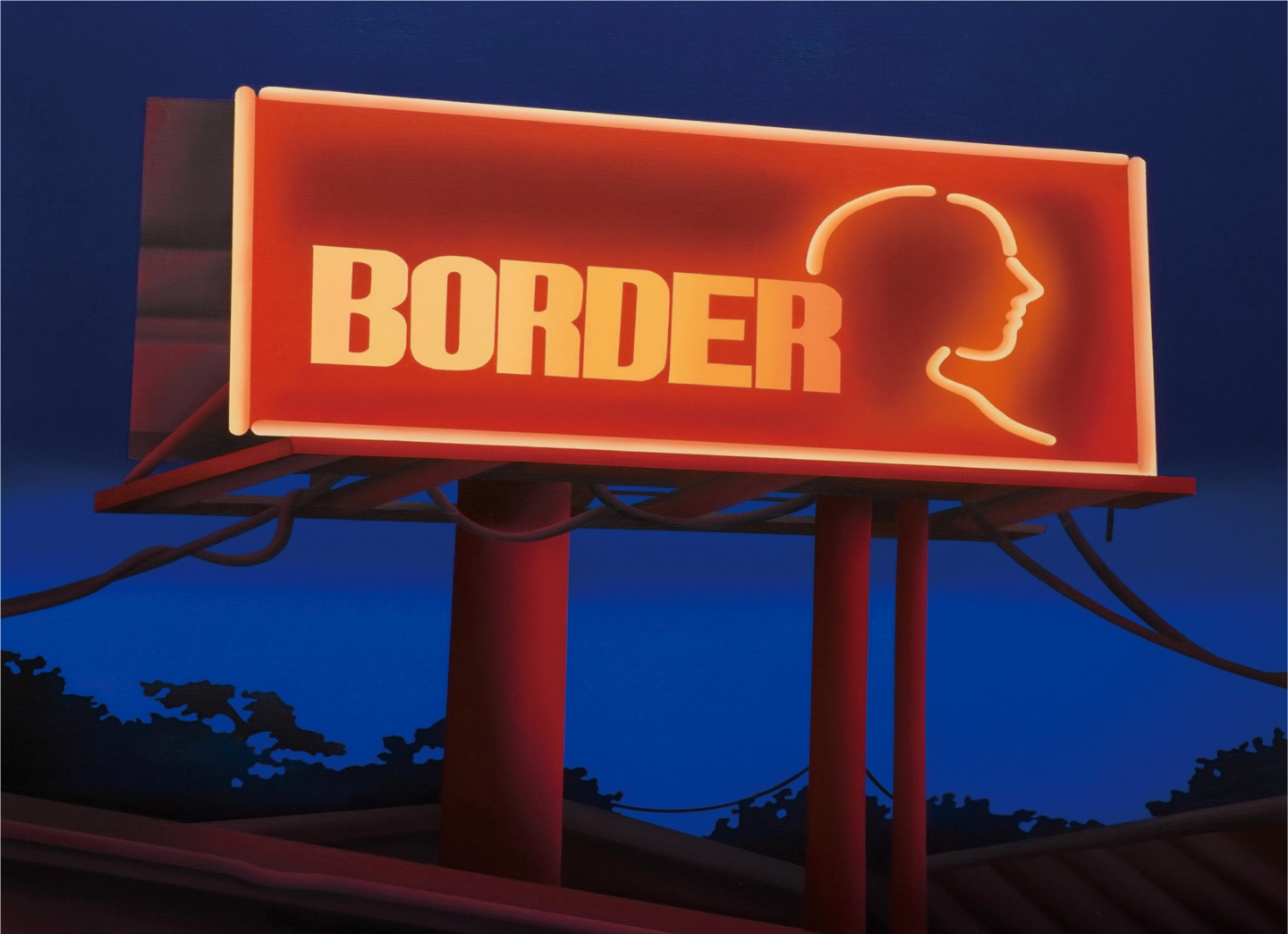 現代における社会問題への言説や警鐘を、「光」と看板を組み合わせて表現しています。今回の滞在制作では「境界」に着目しました。(画像は参考作品)