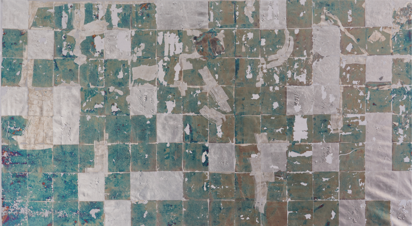 2014年の「凸凹トイレ」から始まった小林の川湯での滞在制作。十年の間に作品はその形を変え、近年は川湯温泉に漂う硫黄成分で銀箔を自然変色させる作品「おんせんへんせんプロジェクト」として開花する。今回は、数年前に制作した、128枚にも及ぶ箔からなる作品に日本画を描く。
