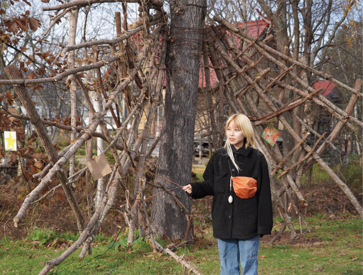 その場にある自然の素材を使用し自然と直接やり取りする。樹木を擬人化し羽根をイメージした。