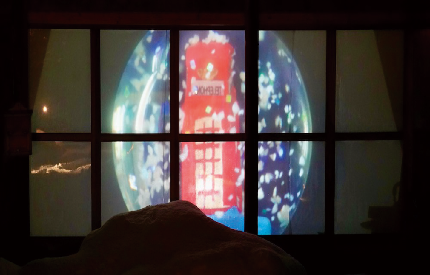 築後70年近い民家の屋根裏に設置されたのは布地に印刷された複数の大きな手。元遊郭であるこの建物には、多くの歴史が刻まれている。「わらべうた」は、向かい合った2人が,歌をうたいながら互いに相手の手を打ち合う遊び歌として使われていた。歌に乗せ相手と戯れるこの冷たい部屋の中、窓から見える風景からはキツネ達が広々と自由に戯れあっている。