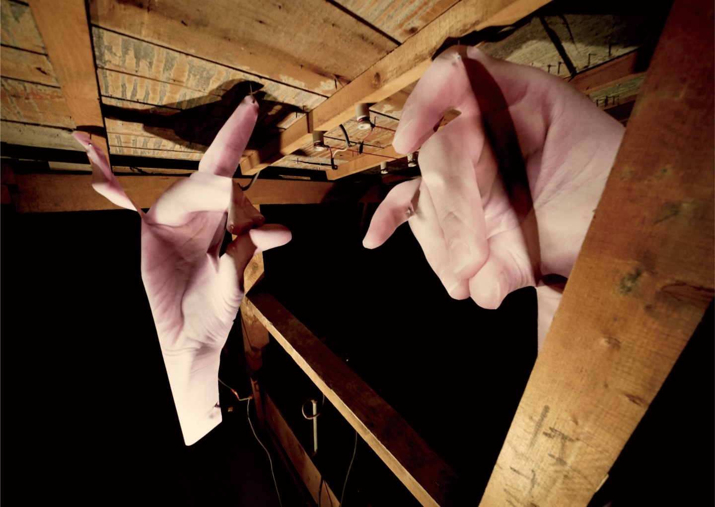 築後70年近い民家の屋根裏に設置されたのは布地に印刷された複数の大きな手。元遊郭であるこの建物には、多くの歴史が刻まれている。「わらべうた」は、向かい合った2人が,歌をうたいながら互いに相手の手を打ち合う遊び歌として使われていた。歌に乗せ相手と戯れるこの冷たい部屋の中、窓から見える風景からはキツネ達が広々と自由に戯れあっている。