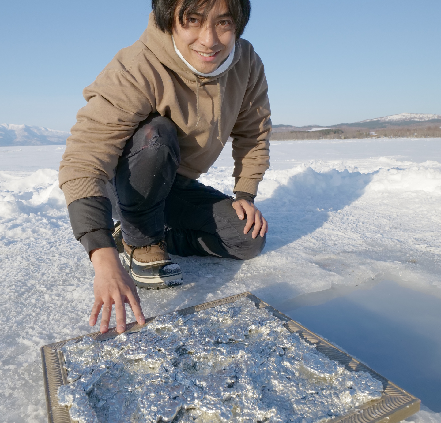 氷結した屈斜路湖上には風の吹きだまり、氷の盛り上がりなどが出現する。それらは日々形を変えていく。変わりゆく自然の造形の一瞬を2024年2月に錫で型取りした作品。本年その作品を上程する。