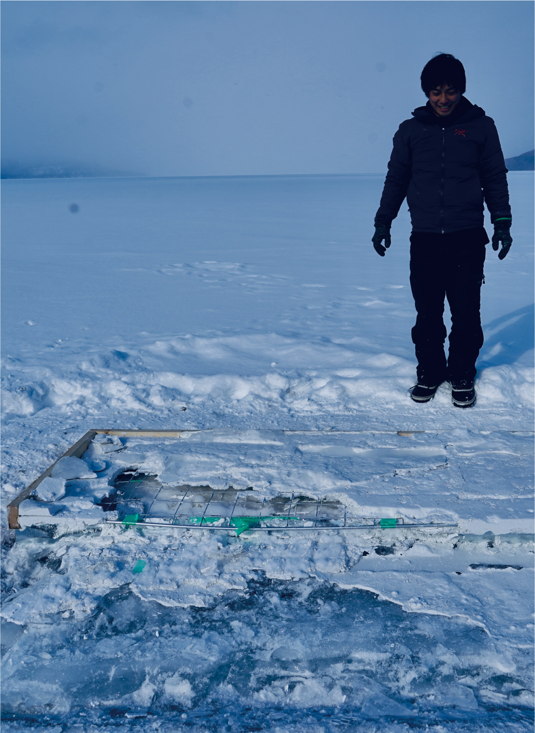 屈斜路湖では氷丘脈の現象が見られるが、気候変動により変化がある。また、中性化が進んで魚が戻ってくるなど湖の環境は変化し続けている。その変化を記録するために、屈斜路湖の水で墨を磨り等高線をトレースする。
