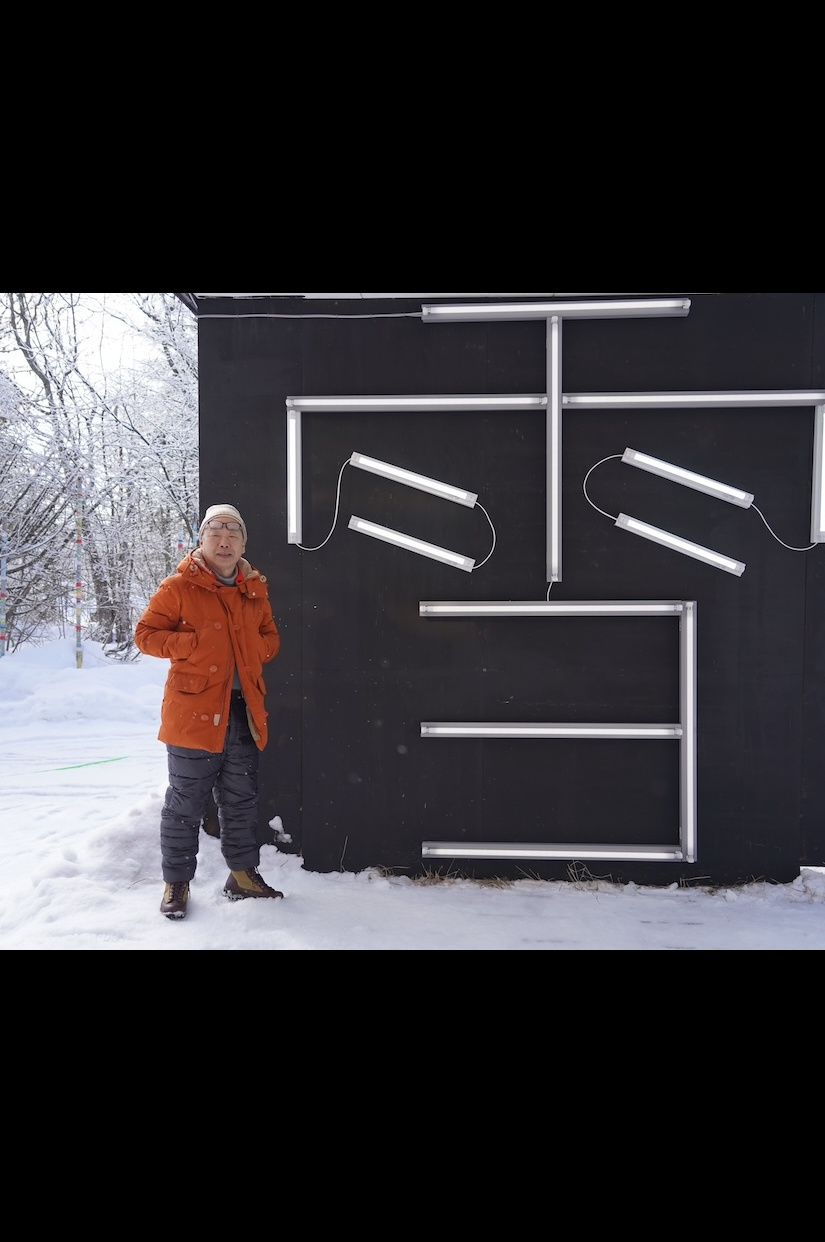 身の回りの素材を作品に取り入れて作品を展開してきた開発好明。その中で規格の決まった蛍光灯を使い文字を制作。雪原を背景に「雪」という文字を浮かび上がらせる。
