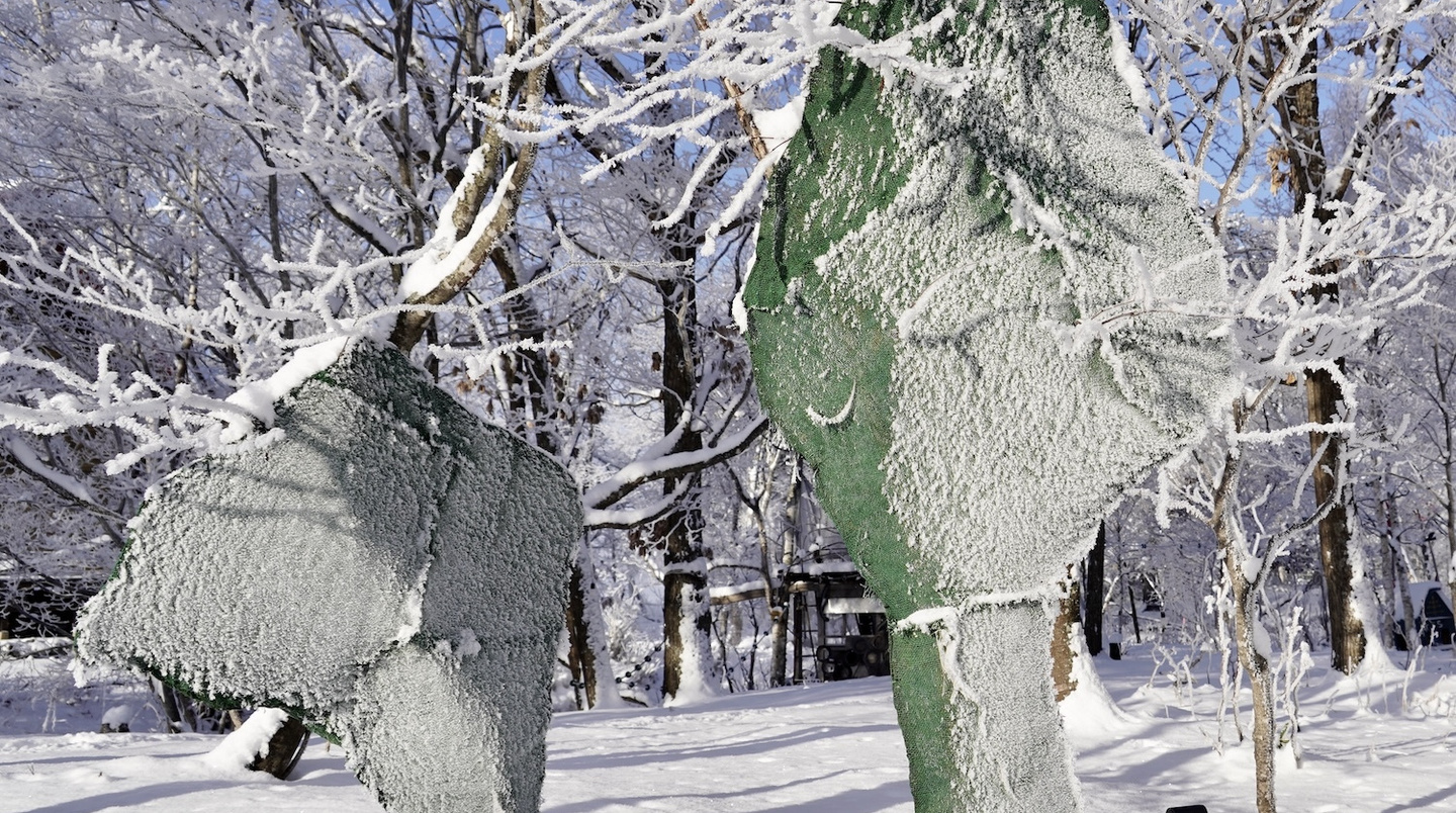 雪が多い地域で行われる「雪囲い」を着想としたこの作品は、冬季により草木が枯れてしまった木々たちを、緑色の木型をした麻袋によって覆われている。季節が進み、春や夏に近づくと、麻袋が膨らんで自然と調和する姿を見せることで、四季の変化を通じながら自然と共に移り変わる「生きる彫刻」として表現した。