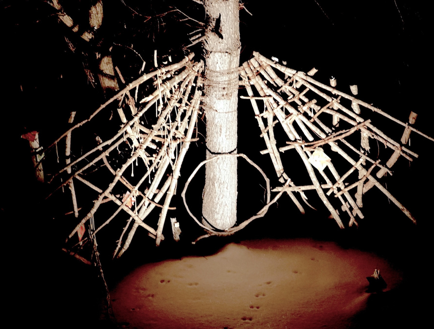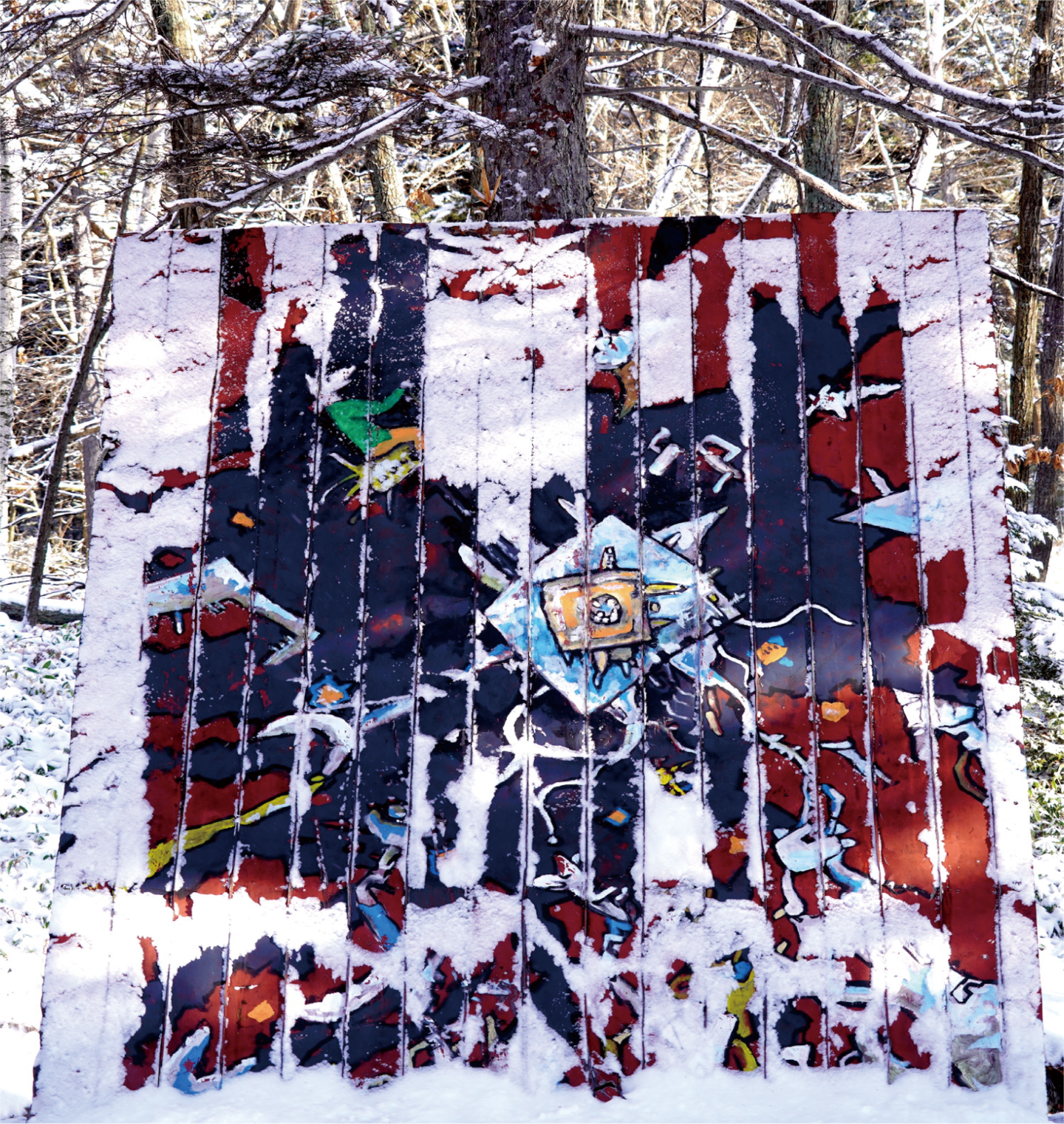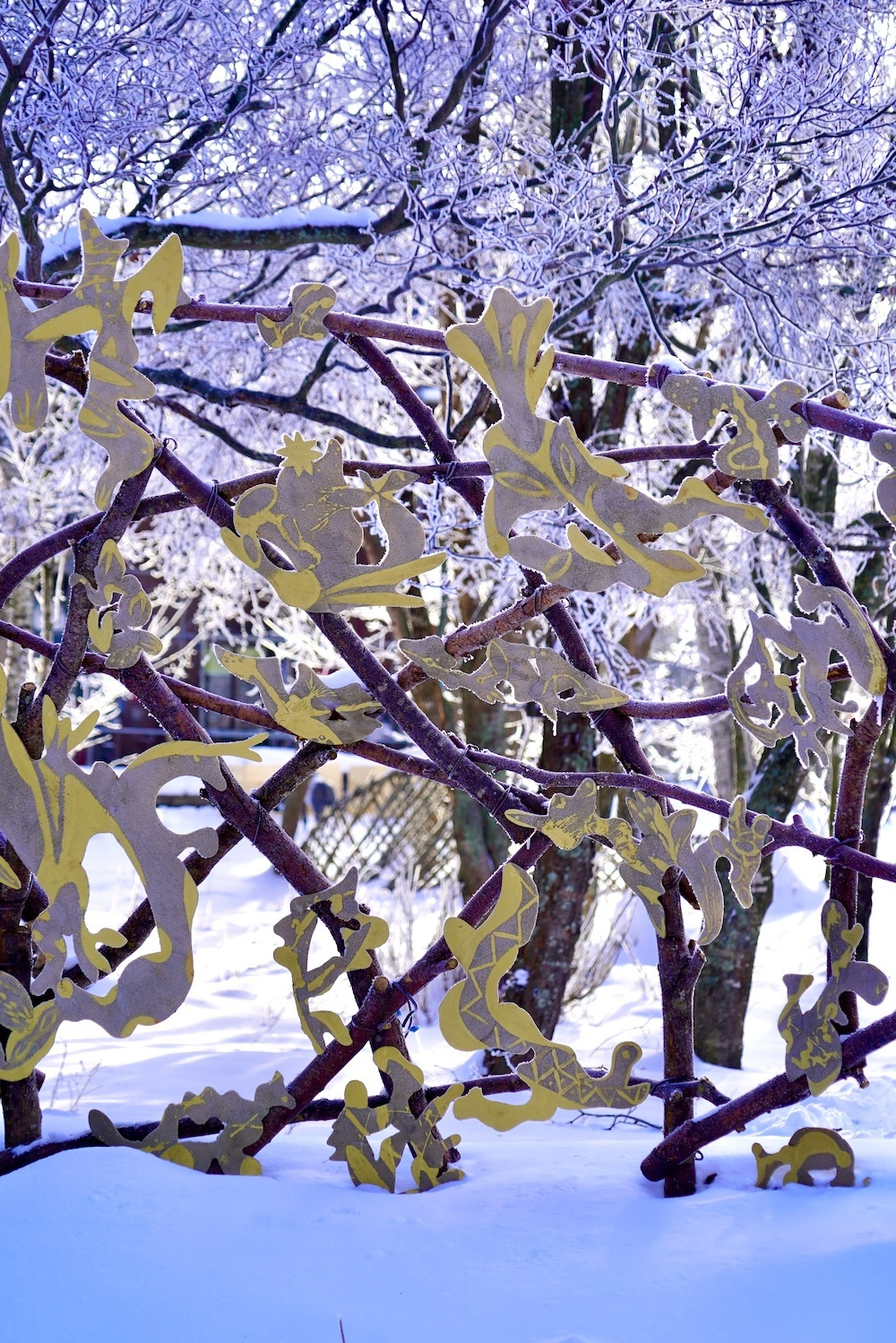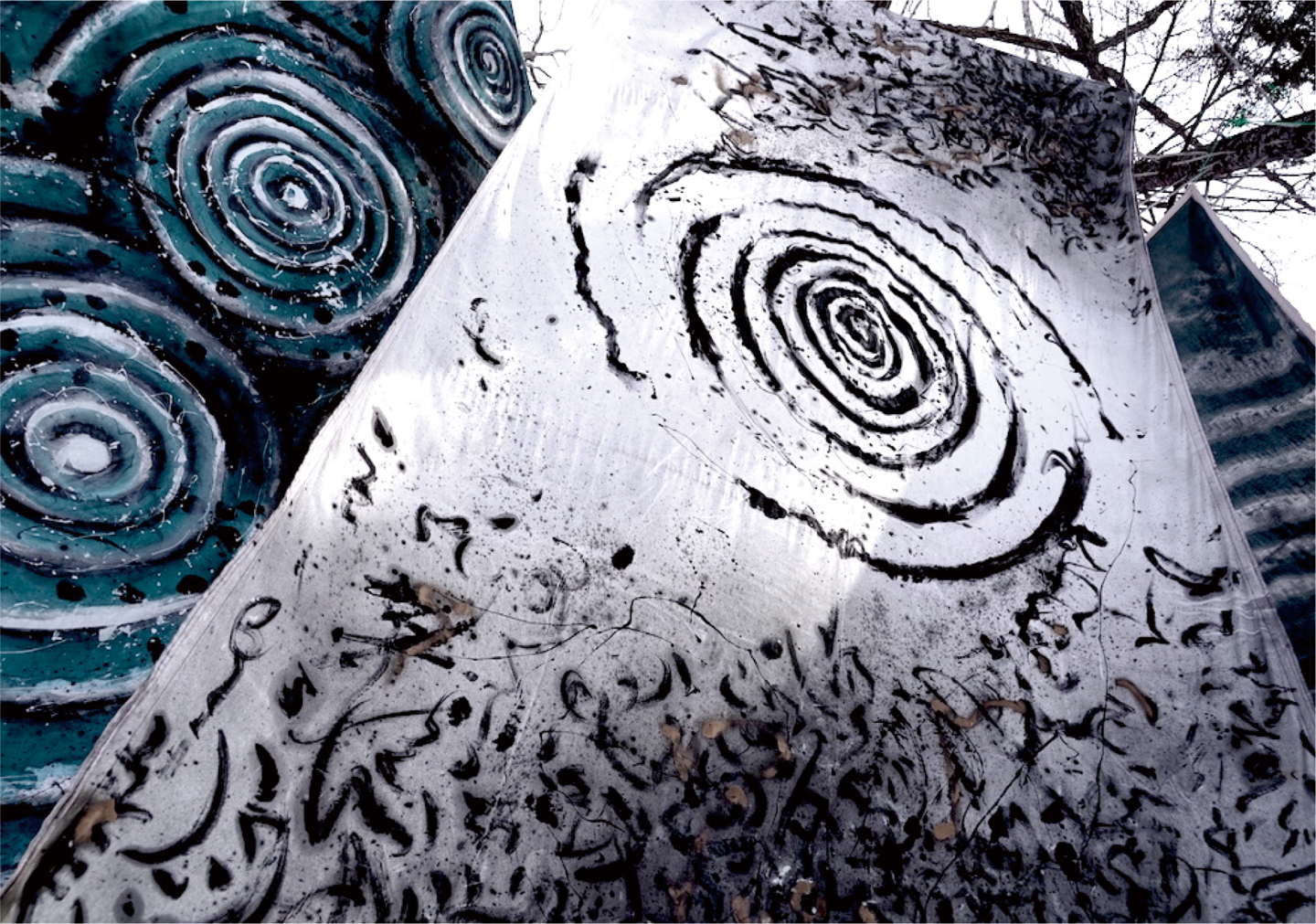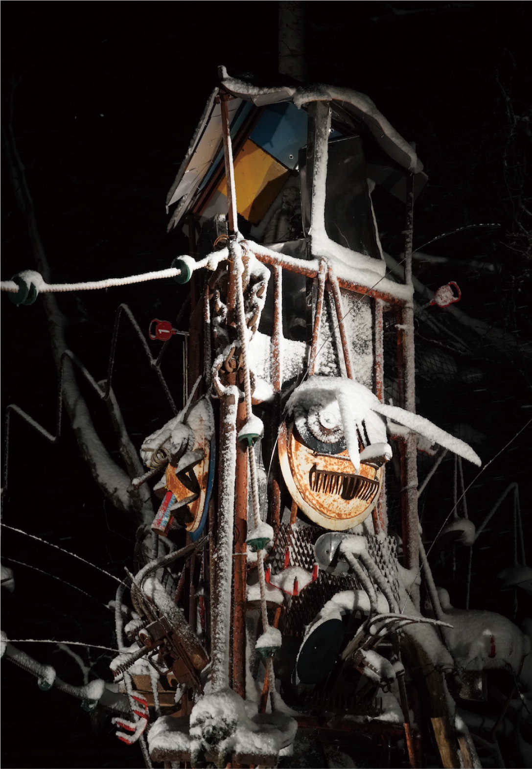 数年前、エコロジカルな素材漆喰を使用し制作した作品は倒木によって崩壊。その後、部分修復にて再生しました。滞在中にコロナに罹患した年には、漆喰部分に絵を描きました。しかし雨風雪極寒の厳しい環境によりまたも作品は風化、腐敗、崩壊。大半を取り壊し現在新しい作品への挑戦が始まっています。