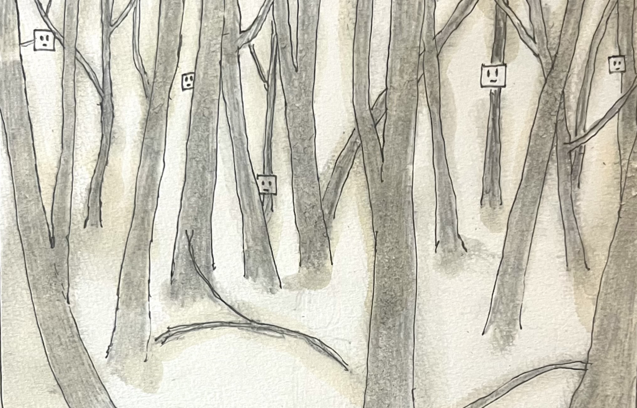 ふと景色を目にしたとき視界の端で何かが動いているような感覚。森の中ではより敏感になる気配への恐怖を視覚化しました。輪郭がない影が今日も誰かを怯えさせている。