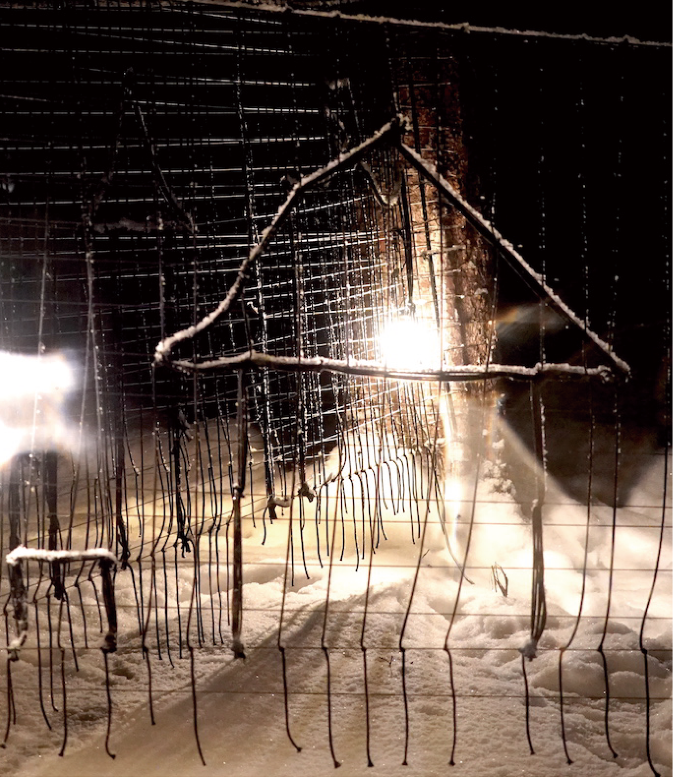 線という要素は、世界の根本的な成り立ちに通じているように感じていて、私の制作の基盤を成すものです。2022年には冬囲いに使われる荒縄や棕櫚縄を「線」として使い制作しました。作品はその後鹿が食べてしまい昨年、鉄での作品になりました。